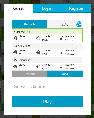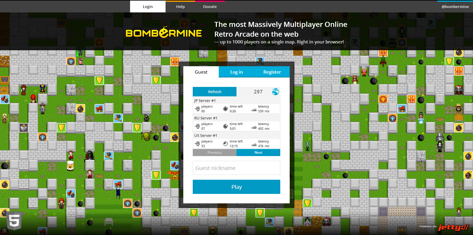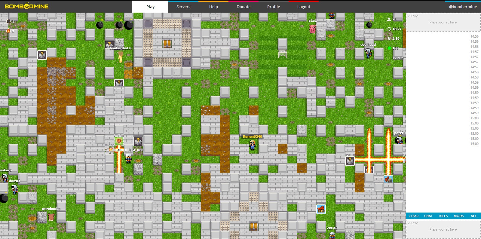 1000人同時対戦ボンバーマン Bombermine!! おもしろサイト 2013年05月18日 広大なマップで1000人が同時対戦できるボンバーマン風のMMOゲーム。(HTML5)ボムを設置してブロックを破壊し、ボーナスアイテムを取得しながら他プレイヤーと戦っていきます。自分のキャラクターが死んでもスペースキーですぐに復活可。1ラウンド20分での合計キル数(同キル数の場合はデス数昇順)を競います。頑丈なブロックに囲まれた爆弾倉庫や宝箱砦など、特殊な地形もあり。【 操作 】方向キー or [ W ][ A ][ S ][ D ] : 移動[ Space ] or [ K ] : ボム設置、復活(死亡時)[ Ctrl ] or [ L ] : リモコン爆弾の起爆、Batの使用[ Q ] : 上空視点[ P ] : スクリーンモード切り替え[ I ] : 家の中で休憩ができる(無敵化)[ Tab ] : スコアボード (Squadsからチーム参戦も可)[ Enter ] : チャットこんな画面がでるので『Guest nickname』のところに好きな名前を入力してPlayを押しましょう。※JP Serverは日本人が多いです、でもそのかわり強い人がたくさんいます。それではBombermineを楽しんでくださいっ!『Bombermine』リンク先へ [2回]