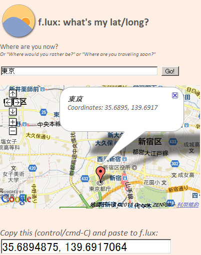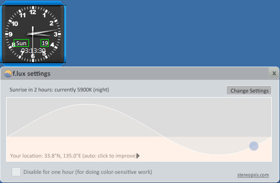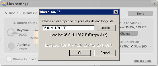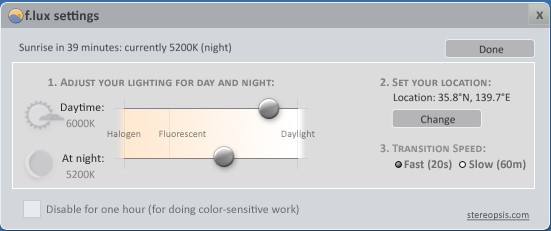 ブルーライト対策 時間に合わせて最適なディスプレイに設定してくれる!! 便利ソフト 2013年05月19日 日照時間に合わせてディスプレイの色温度を自動で調整してくれるフリーソフト最近よく言われるブルーライト問題ですが、パソコン作業によって目が疲れる方は、一度このフリーソフトを使って調整してみては如何でしょうか。↓使い方↓まず起動したら右上の『Change Settings』をクリックします1 『色温度の設定』昼と夜の色温度の変化を設定します「Daytime」昼の色温度を設定「At night」夜の色温度を設定しますおすすめ設定は昼は6000K、夜は5200Kぐらいが良いと思いますが個人で調整してみてください。2 『 現在地の設定』色温度の調整が完了したら右上の「SET YOUR LOCATION」にて現在地を変更します次の画面で「Locate」をクリックしますページが開きますので自分の地名などを入力して経度、緯度を取得します取得した経度、緯度を貼り付けてOKをクリックします3 『変化するスピード』「TRANSITION SPEED」は色温度が変化するスピードを調整できます。即座に変えたい場合は20sに、ゆっくりと目を慣らしながら変化させたい場合は60sにすると良いと思います最後にグラフをクリックするとプレビューを見る事が出来ます調整が完了したらウィンドウを閉じれば完了です『レビュー』時間に合わせてディスプレイの色温度を変更してくれる便利なフリーソフトナナオのディスプレイを使っていますが常時6000Kを設定しています。時折目が痛い、疲れている際は5500Kに落としたりして調整していますが500Kも変われば随分と目が楽になったりします最近のディスプレイは明るく設定されていたりする場合もあるのでこのフリーソフトを使う前に一度ディスプレイの設定にて色温度や輝度を設定を下げたりしてみてそれでも目が疲れる場合はこのソフトを使ってみては如何でしょうか『f.lux』DLサイトへ [1回]PR